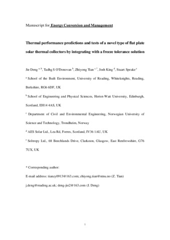 Deng, J. orcid id iconORCID: https://orcid.org/0000-0001-6896-8622, O'Donovan, T. S., Tian, Z., King, J. and Speake, S. (2019) Thermal performance predictions and tests of a novel type of flat plate solar thermal collectors by integrating with a freeze tolerance solution. Energy Conversion and Management, 198. 111784. ISSN 0196-8904 doi: 10.1016/j.enconman.2019.111784
