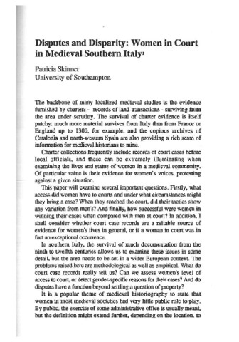 Skinner, P. (1996) Disputes and disparity: women in court in medieval southern Italy. Reading Medieval Studies, XXII. pp. 85-105. ISSN 0950-3129