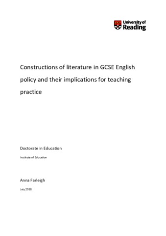 Farleigh, A. (2018) Constructions of literature in GCSE English policy and their implications for teaching practice. EdD thesis, University of Reading. doi: 10.48683/1926.00084744