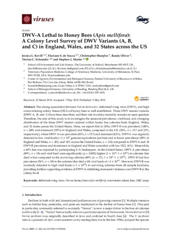 Kevill, J. L., Souza, F. S. d., Sharples, C., Oliver, R., Schroeder, D. C. and Martin, S. J. (2019) DWV-A lethal to honey bees (Apis mellifera): a colony level survey of DWV variants (A, B, and C) in England, Wales, and 32 states across the US. Viruses, 11 (5). 426. ISSN 1999-4915 doi: 10.3390/v11050426