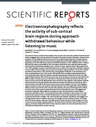 Daly, I., Williams, D., Hwang, F. orcid id iconORCID: https://orcid.org/0000-0002-3243-3869, Kirke, A., Miranda, E. R. and Nasuto, S. orcid id iconORCID: https://orcid.org/0000-0001-9414-9049 (2019) Electroencephalography reflects the activity of sub-cortical brain regions during approach-withdrawal behaviour while listening to music. Scientific Reports, 9 (1). 9415. ISSN 2045-2322 doi: 10.1038/s41598-019-45105-2