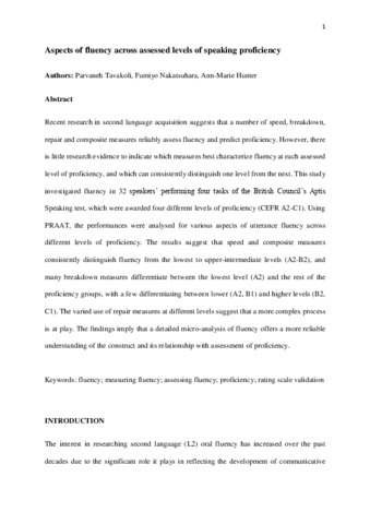 Recent research in second language acquisition suggests that a number of speed, breakdown, repair and composite measures reliably assess fluency and predict proficiency. However, there is little research evidence to indicate which measures best characterize fluency at each assessed level of proficiency, and which can consistently distinguish one level from the next. This study investigated fluency in 32 speakers’ performing four tasks of the British Council’s Aptis Speaking test, which were awarded four different levels of proficiency (CEFR A2-C1). Using PRAAT, the performances were analysed for various aspects of utterance fluency across different levels of proficiency. The results suggest that speed and composite measures consistently distinguish fluency from the lowest to upper-intermediate levels (A2-B2), and many breakdown measures differentiate between the lowest level (A2) and the rest of the proficiency groups, with a few differentiating between lower (A2, B1) and higher levels (B2, C1). The varied use of repair measures at different levels suggest that a more complex process is at play. The findings imply that a detailed micro-analysis of fluency offers a more reliable understanding of the construct and its relationship with assessment of proficiency.