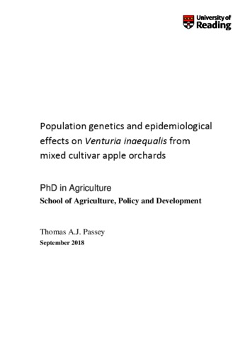 Passey, T. A. J. (2019) Population genetics and epidemiological effects on Venturia inaequalis from mixed cultivar apple orchards. PhD thesis, University of Reading. doi: 10.48683/1926.00084872