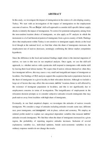 In this study, we investigate the impact of immigration in the context of a developing country, Turkey. We start with an investigation of the impact of immigration on the employment outcome of natives. We use Borjas’ skill-cell approach to consider skill-specific labour supply shocks to identify the impact of immigration. To correct for potential endogeneity arising from the non-random location choice of immigrants, we also apply an IV analysis in which the instrument is a la Card historical pattern of immigrants from a given country of birth. Findings show that employment within Turkey is not sensitive to immigrant supply shocks at the local level though at the national level, we find that when the share of immigrants increases, the employment rate of natives decreases, seemingly confirming the labour market competition hypothesis. Since the difference in the local and national findings might relate to the internal migration of natives, we turn to this next in our empirical analysis. Once again, we use the skill-cell approach, i.e. whether natives with a particular skill respond to immigrants with similar skill by leaving their local labour market. We expect that if natives relocate themselves when they face immigrant inflows, this may cause a very small and insignificant impact of immigrants at localities. Our findings of OLS analysis support this suspicion that native population factors in the share of immigrants in a given locality in their relocation decision. Although we include a large set of factors that may affect this movement, natives’ location choice is still affected by the existence of immigrant population in localities, and this is not significantly due to employment concerns in terms of in-migration. The insignificance of employment in the relocation decision prompts us to consider subjective attitudes towards immigrants that may push natives away from localities with high share of immigrants. Eventually, in our final empirical chapter, we investigate the attitudes of natives towards immigrants. We consider a range of attitudes including attitudes towards same race, different race, poor immigrants, and immigrants’ role in place, culture and economy. We employ an ordered probit model to explain our categorical dependent variables that measure natives’ attitudes towards immigrants. We find that when the share of immigrants increased in a given region, the probability of reporting negative attitudes increases. Inclusion of several explanatory variables (i.e., individual opinions, beside socio-economic variables) in our ordinary response models do not change the results.In this study, we investigate the impact of immigration in the context of a developing country, Turkey. We start with an investigation of the impact of immigration on the employment outcome of natives. We use Borjas’ skill-cell approach to consider skill-specific labour supply shocks to identify the impact of immigration. To correct for potential endogeneity arising from the non-random location choice of immigrants, we also apply an IV analysis in which the instrument is a la Card historical pattern of immigrants from a given country of birth. Findings show that employment within Turkey is not sensitive to immigrant supply shocks at the local level though at the national level, we find that when the share of immigrants increases, the employment rate of natives decreases, seemingly confirming the labour market competition hypothesis. Since the difference in the local and national findings might relate to the internal migration of natives, we turn to this next in our empirical analysis. Once again, we use the skill-cell approach, i.e. whether natives with a particular skill respond to immigrants with similar skill by leaving their local labour market. We expect that if natives relocate themselves when they face immigrant inflows, this may cause a very small and insignificant impact of immigrants at localities. Our findings of OLS analysis support this suspicion that native population factors in the share of immigrants in a given locality in their relocation decision. Although we include a large set of factors that may affect this movement, natives’ location choice is still affected by the existence of immigrant population in localities, and this is not significantly due to employment concerns in terms of in-migration. The insignificance of employment in the relocation decision prompts us to consider subjective attitudes towards immigrants that may push natives away from localities with high share of immigrants. Eventually, in our final empirical chapter, we investigate the attitudes of natives towards immigrants. We consider a range of attitudes including attitudes towards same race, different race, poor immigrants, and immigrants’ role in place, culture and economy. We employ an ordered probit model to explain our categorical dependent variables that measure natives’ attitudes towards immigrants. We find that when the share of immigrants increased in a given region, the probability of reporting negative attitudes increases. Inclusion of several explanatory variables (i.e., individual opinions, beside socio-economic variables) in our ordinary response models do not change the results.
