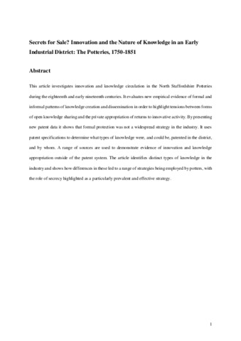 This article investigates innovation and knowledge circulation in the North Staffordshire Potteries during the eighteenth and early nineteenth centuries. It evaluates new empirical evidence of formal and informal patterns of knowledge creation and dissemination in order to highlight tensions between forms of open knowledge sharing and the private appropriation of returns to innovative activity. By presenting new patent data it shows that formal protection was not a widespread strategy in the industry. It uses patent specifications to determine what types of knowledge were, and could be, patented in the district, and by whom. A range of sources are used to demonstrate evidence of innovation and knowledge appropriation outside of the patent system. The article identifies distinct types of knowledge in the industry and shows how differences in these led to a range of strategies being employed by potters, with the role of secrecy highlighted as a particularly prevalent and effective strategy.