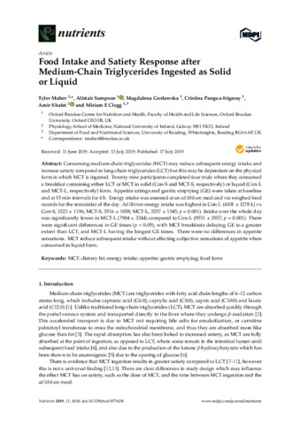 Maher, T., Sampson, A., Goslawska, M., Pangua-Irigaray, C., Shafat, A. and Clegg, M. E. (2019) Food intake and satiety response after medium-chain triglycerides ingested as solid or liquid. Nutrients, 11 (7). 1638. ISSN 2072-6643 doi: 10.3390/nu11071638