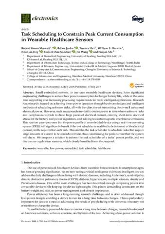 Task scheduling to constrain peak current consumption in wearable healthcare sensors.
