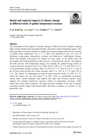 Global and regional impacts of climate change at different levels of global temperature increase.