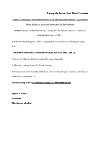 Robson, H., Griffiths, T. D., Grube, M. and Woollams, A. M. (2019) Auditory, phonological and semantic factors in the recovery from Wernicke’s aphasia post stroke: predictive value and implications for rehabilitation. Neurorehabilitation and Neural Repair, 33 (10). pp. 800-812. ISSN 15526844 doi: 10.1177/1545968319868709