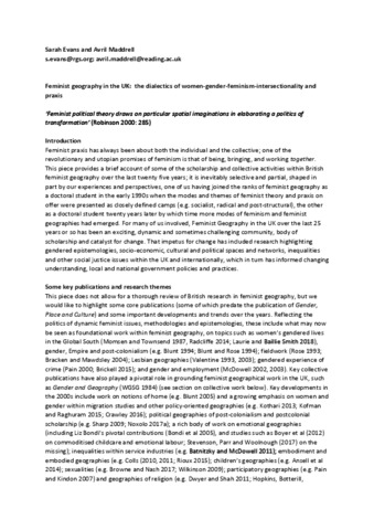 Feminist geography in the UK: the dialectics of women-gender-feminism-intersectionality and praxis.