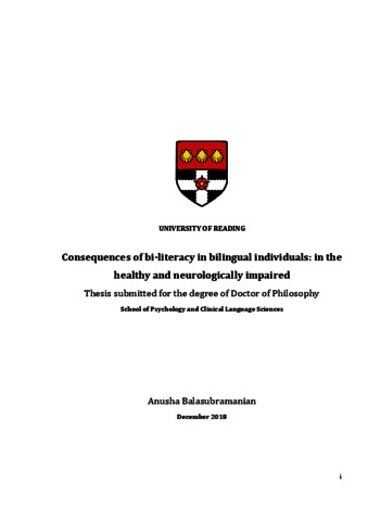 Balasubramanian, A. (2019) Consequences of bi-literacy in bilingual individuals: in the healthy and neurologically impaired. PhD thesis, University of Reading. doi: 10.48683/1926.00085070