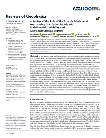 Zhang, R., Sutton, R. orcid id iconORCID: https://orcid.org/0000-0001-8345-8583, Danabasoglu, G., Kwon, Y.‐O., Marsh, R., Yeager, S. G., Amrhein, D. E. and Little, C. M. (2019) A review of the role of the Atlantic meridional overturning circulation in Atlantic multidecadal variability and associated climate impacts. Reviews of Geophysics, 57 (2). pp. 316-375. ISSN 8755-1209 doi: 10.1029/2019RG000644