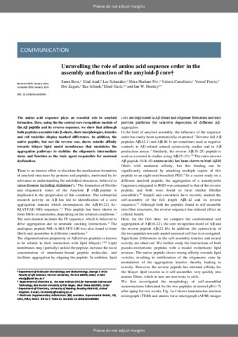 Bera, S., Arad, E., Schnaider, L., Shaham-Niv, S., Castelletto, V., Peretz, Y., Zaguri, D., Jelinek, R., Gazit, E. and Hamley, I. W. orcid id iconORCID: https://orcid.org/0000-0002-4549-0926 (2019) Unravelling the role of amino acid sequence order in the assembly and function of the amyloid-β core. Chemical Communications, 55 (59). pp. 8595-8598. ISSN 1359-7345 doi: 10.1039/C9CC03654G