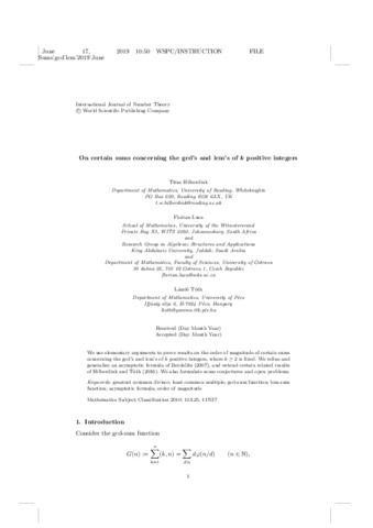Hilberdink, T., Luca, F. and Toth, L. (2020) On certain sums concerning the gcd’s and lcm’s of k positive integers. International Journal of Number Theory, 16 (1). pp. 77-90. ISSN 1793-7310 doi: 10.1142/S1793042120500049