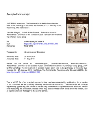 Morgan, J., Butler-Browne, G., Muntoni, F. and Patel, K. (2019) 240th ENMC workshop: the involvement of skeletal muscle stem cells in the pathology of muscular dystrophies 25 -27 January 2019, Hoofddorp, the Netherlands. Neuromuscular Disorders, 29 (9). pp. 704-715. ISSN 0960-8966 doi: 10.1016/j.nmd.2019.07.003