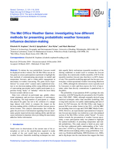 To inform the way probabilistic forecasts would be displayed on their website, the UK Met Office ran an online game as a mass participation experiment to highlight the best methods of communicating uncertainty in rainfall and temperature forecasts, and to widen public engagement in uncertainty in weather forecasting. The game used a hypothetical “ice-cream seller” scenario and a randomized structure to test decision-making ability using different methods of representing uncertainty and to enable participants to experience being “lucky” or “unlucky” when the most likely forecast scenario did not occur. Data were collected on participant age, gender, educational attainment, and previous experience of environmental modelling. The large number of participants (n > 8000) that played the game has led to the collation of a unique large dataset with which to compare the impact on the decision-making ability of different weather forecast presentation ormats. This analysis demonstrates that within the game the provision of information regarding forecast uncertainty greatly improved decision-making ability and did not cause confusion in situations where providing the uncertainty added no further information.
