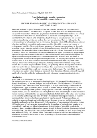 Surrey has a diverse range of Mesolithic occupation evidence, spanning the Early Mesolithic, Horsham period and the Later Mesolithic. This paper collates these data and then quantitatively analyses the relationships between the geographical distributions of Mesolithic material and a range of environmental characteristics. The distribution of material is also analysed using a GIS to understand where ‘hotspots’ (and ‘coldspots’) of activity may be located and takes into account variations in collecting activity and modern discovery opportunities. There is evidence that the environment may have been important in determining the spatial extent of Mesolithic hunter-gatherer behaviour, and this is assessed through comparison of the Mesolithic resource and a range of environmental variables. The record shows a prevalence of hunting-type assemblages in the south-west of the county, where the majority of microliths and points were identified, together with sites with evidence for occupation (often excavated as such, or with evidence for domestic activities such as burning). There was also evidence that records identified on higher elevations and steeper slopes appeared to represent items used, discarded or lost on hunting trips and potentially highlighted the importance of these regions as lookout or observation locations; however, there was a lack of occupation sites based near these optimal viewing locations. The majority of occupation sites were located across an east--west Greensand band, and situated within 5km of the Clay-with-Flints outcrops. These were wet/dry marginal regions, probably conducive to settlement owing to the benefits these locations may have had for hunting and gathering. A lower density of records from north-west and south-east Surrey appear to indicate these areas were used primarily for the processing of material while people were moving across the landscape. The overall high proportion of findspots and scatters within the dataset may result from the nature of hunter-gatherer living, with high levels of mobility within the landscape alongside ephemeral occupation and activity sites.