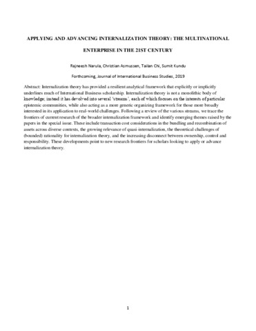 Internalization theory has provided a resilient analytical framework that explicitly or implicitly underlines much of International Business scholarship. Internalization theory is not a monolithic body of knowledge; instead it has devolved into several ‘streams’, each of which focuses on the interests of particular epistemic communities, while also acting as a more generic organizing framework for those more broadly interested in its application to real-world challenges. Following a review of the various streams, we trace the frontiers of current research of the broader internalization framework and identify emerging themes raised by the papers in the special issue. These include transaction cost considerations in the bundling and recombination of assets across diverse contexts, the growing relevance of quasi-internalization, the theoretical challenges of (bounded) rationality for internalization theory, and the increasing disconnect between ownership, control and responsibility. These developments point to new research frontiers for scholars looking to apply or advance internalization theory.
