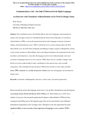 Tesseur, W. (2019) Communication is aid - but only if delivered in the right language: an interview with translators without borders on its work in danger zones. Journal of War & Culture Studies, 12 (3). pp. 285-294. ISSN 1752-6272 doi: 10.1080/17526272.2019.1644416
