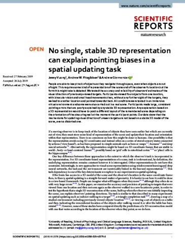 Vuong, J., Fitzgibbon, A. W. and Glennerster, A. orcid id iconORCID: https://orcid.org/0000-0002-8674-2763 (2019) No single, stable 3D representation can explain pointing biases in a spatial updating task. Scientific Reports, 9 (1). 12578. ISSN 2045-2322 doi: 10.1038/s41598-019-48379-8