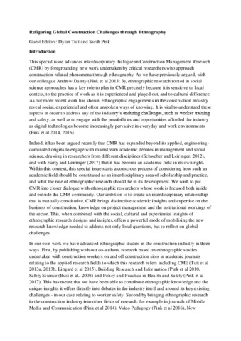Tutt, D. orcid id iconORCID: https://orcid.org/0000-0001-9216-8617 and Pink, S. (2019) Refiguring global construction challenges through ethnography. Construction Management and Economics, 37 (9). pp. 475-480. ISSN 0144-6193 doi: 10.1080/01446193.2019.1643570