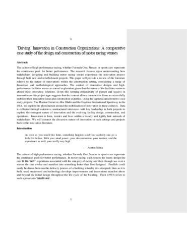 The culture of high-performance racing, whether Formula One, Nascar, or sports cars represents the continuous push for better performance. The research focuses upon understanding how stakeholders designing and building motor racing venues experience the innovation process through both new and refurbishment projects. This paper will provide a review of the literature relative to the nature of innovations within the construction setting, considering a range of theoretical and methodological approaches. The context of innovative designs and high-performance facilities serves as a novel exploration given that the nature of the facilities seems to attract these innovative solutions. Given this seeming repeatability of pursuit and success in innovation on this project type suggests that the context allows construction firms to successfully mobilize their innovative ideas and construction expertise. Using the captured data from two case study projects; Yas Marina Circuit in Abu Dhabi and the Daytona International Speedway in the USA, we explore the phenomenon around the mobilization of innovation in these contexts. Data is collected through extensive, unstructured interviews with key leadership in both projects to explore the emergent nature of innovation and the evolving facility design, construction, and operations. Innovation is born, resides and lives within a loosely and tightly knit network of stakeholders. We will connect the discursive nature of innovation in such settings and projects back to the innovation literature.
