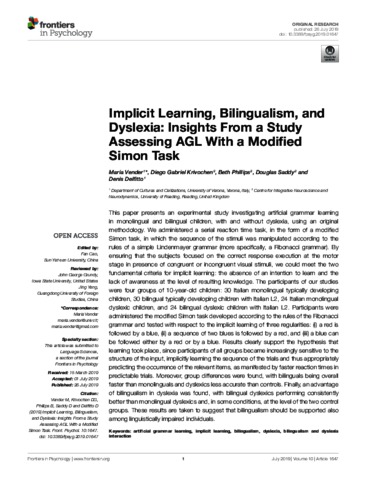 Implicit learning, bilingualism, and dyslexia: insights from a study assessing AGL with a modified Simon task.