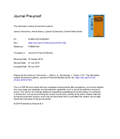 Oikonomou, I., Stancu, A., Symeonidis, L. and Wese Simen, C. (2019) The information content of short-term options. Journal of Financial Markets, 46. 100504. ISSN 1386-4181 doi: 10.1016/j.finmar.2019.07.003