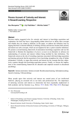 Murayama, K., Fitzgibbon, L. orcid id iconORCID: https://orcid.org/0000-0002-8563-391X and Sakaki, M. orcid id iconORCID: https://orcid.org/0000-0003-1993-5765 (2019) Process account of curiosity and interest: a reward-learning perspective. Educational Psychology Review, 31 (4). pp. 875-895. ISSN 1040-726X doi: 10.1007/s10648-019-09499-9