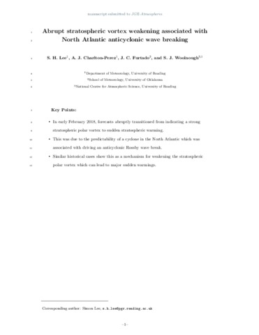 Abrupt stratospheric vortex weakening associated with North Atlantic anticyclonic wave breaking.