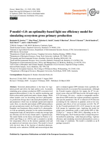 Stocker, B. D., Wang, H., Smith, N., Harrison, S. P. orcid id iconORCID: https://orcid.org/0000-0001-5687-1903, Keenan, T., Sandoval, D., Davis, T. and Prentice, I. C. (2020) P-model v1.0: an optimality-based light use efficiency model for simulating ecosystem gross primary production. Geoscientific Model Development Discussions, 13 (3). pp. 1545-1581. ISSN 1991-962X doi: 10.5194/gmd-13-1545-2020