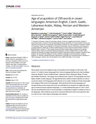 Age of acquisition of 299 words in seven languages: American English, Czech, Gaelic, Lebanese Arabic, Malay, Persian and Western Armenian.