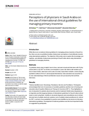 Dobia, A., Ryan, K., Abutaleb, M. and Edwards, A. orcid id iconORCID: https://orcid.org/0000-0003-2369-989X (2019) Perceptions of physicians in Saudi Arabia on the use of international clinical guidelines for managing primary insomnia. PLoS ONE, 14 (8). e0220960. ISSN 1932-6203 doi: 10.1371/journal.pone.0220960