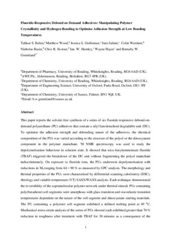 Fluoride-responsive debond on demand adhesives: manipulating polymer crystallinity and hydrogen bonding to optimise adhesion strength at low bonding temperatures.