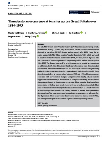 The UK Met Office's Daily Weather Reports (DWR) contain extensive logs of UK thunderstorm activity. To date, only a very small fraction of these data have been digitized as part of the MIDAS dataset, and exclusively after 1950. Using the recently‐scanned UK Met Office Monthly Weather Reports (MWR), which are based on a subset of the observations that form the DWR, we here provide digitized data and a summary of thunderdays from 10 long‐running British stations over the period 1884–1993. The data are presented ‘as is’, with no attempt to provide any corrections or calibration. For 4 of the 10 stations, thunderday observations were discontinued at various times between 1949 and 1964, and it is necessary to switch to a neighbouring station in order to continue the series. Approximately half the series exhibit sharp drops in thunderdays at various points between 1960 and 1990, although none are coincident with known station changes. Comparison with nearby MIDAS stations suggests the low thunderdays are the result of changes in observing practice, rather than genuine changes in thunderstorm occurrence. These potential data issues limit interpretation of the long‐term trends. However, it can nevertheless be concluded that none of the stations show the expected increase in thunderdays as a result of the rise in surface temperature over the 20th century. In order to provide more quantitative determination of the long‐term trends in thunderstorm occurrence, we advocate further digitization efforts to recover the data from the numerous stations in the MWRs, and subsequent analysis of the common signals across neighbouring stations.