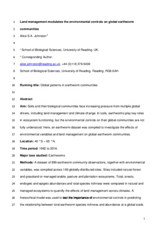 Aim Soils and their biological communities face increasing pressure from multiple global drivers, including land management and climate change. In soils, earthworms play key roles in ecosystem functioning, but the environmental controls on their global communities are not fully understood. Here, an earthworm dataset was compiled to investigate the effects of environmental variables and land management on global earthworm communities. Location 40° S–65° N. Time period 1962 to 2016. Major taxa studied Earthworms. Methods A dataset of 899 earthworm community observations, together with environmental variables, was compiled across 169 globally distributed sites. Sites included natural forest and grassland or managed arable, pasture and plantation ecosystems. Total, anecic, endogeic and epigeic abundances and total species richness were compared in natural and managed ecosystems to quantify the effects of land management across climates. A hierarchical model was used to test the importance of environmental controls in predicting the relationship between total earthworm species richness and abundance at a global scale. Results Land management prompted little change in total earthworm abundance at the global scale, but reduced species richness and shifted community composition. Endogeic earthworms were more abundant in managed ecosystems, while anecic and epigeic earthworms showed variable responses across ecosystem types. Global relationships between total earthworm species richness and abundance were explained by climate, soil pH and land management. Main conclusions Land management modulates the effects of environmental controls on global earthworm communities, through direct disturbance and indirect changes in edaphic conditions.