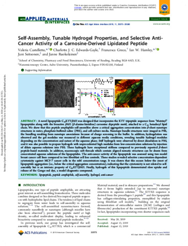 Self-assembly, tunable hydrogel properties and selective anti-cancer activity of a carnosine-derived lipidated peptide.