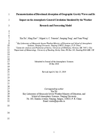 Xu, X., Xue, M., Teixeira, M. A. C. orcid id iconORCID: https://orcid.org/0000-0003-1205-3233, Tang, J. and Wang, Y. (2019) Parameterization of directional absorption of orographic gravity waves and its impact on the atmospheric general circulation simulated by the Weather Research and Forecasting Model. Journal of the Atmospheric Sciences, 76 (11). pp. 3435-3453. ISSN 1520-0469 doi: 10.1175/JAS-D-18-0365.1