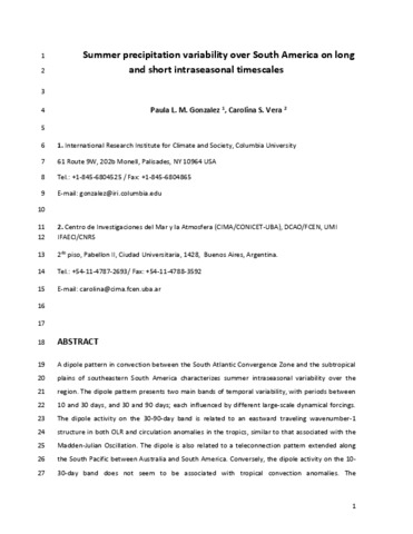 Gonzalez, P. L. M. orcid id iconORCID: https://orcid.org/0000-0003-0154-0087 and Vera, C. S. (2014) Summer precipitation variability over South America on long and short intraseasonal timescales. Climate Dynamics, 43 (7). pp. 1993-2007. ISSN 0930-7575 doi: 10.1007/s00382-013-2023-2