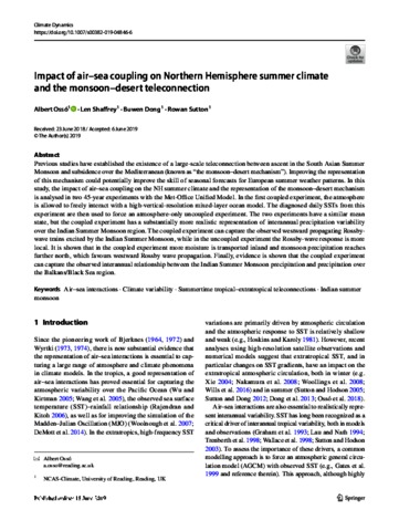 Previous studies have established the existence of a large-scale teleconnection between ascent in the South Asian Summer Monsoon and subsidence over the Mediterranean (known as “the monsoon–desert mechanism”). Improving the representation of this mechanism could potentially improve the skill of seasonal forecasts for European summer weather patterns. In this study, the impact of air–sea coupling on the NH summer climate and the representation of the monsoon–desert mechanism is analysed in two 45-year experiments with the Met-Office Unified Model. In the first coupled experiment, the atmosphere is allowed to freely interact with a high-vertical-resolution mixed-layer ocean model. The diagnosed daily SSTs from this experiment are then used to force an atmosphere-only uncoupled experiment. The two experiments have a similar mean state, but the coupled experiment has a substantially more realistic representation of interannual precipitation variability over the Indian Summer Monsoon region. The coupled experiment can capture the observed westward propagating Rossby-wave trains excited by the Indian Summer Monsoon, while in the uncoupled experiment the Rossby-wave response is more local. It is shown that in the coupled experiment more moisture is transported inland and monsoon precipitation reaches further north, which favours westward Rossby wave propagation. Finally, evidence is shown that the coupled experiment can capture the observed interannual relationship between the Indian Summer Monsoon precipitation and precipitation over the Balkans/Black Sea region.