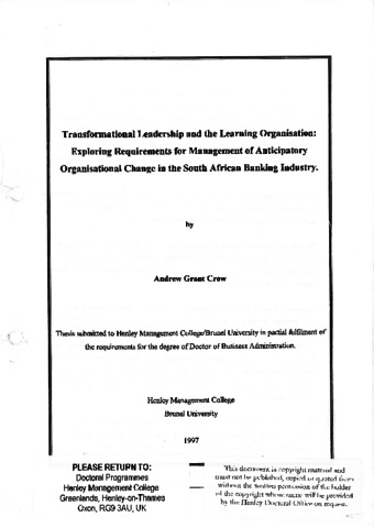 Crow, A. G. (1997) Transformational leadership and the learning organisation: exploring requirements for management of anticipatory organisational change in the South African banking industry. DBA thesis, Henley Business School, University of Reading.