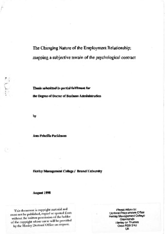 Parkinson, A. P. (1998) The changing nature of the employment relationship: mapping a subjective terrain of the psychological contract. DBA thesis, Henley Business School, University of Reading.
