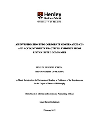 Elshahoubi, I. S. (2019) An investigation into corporate governance (CG) and accountability practices: evidence from Libyan listed companies. PhD thesis, University of Reading. doi: 10.48683/1926.00085882