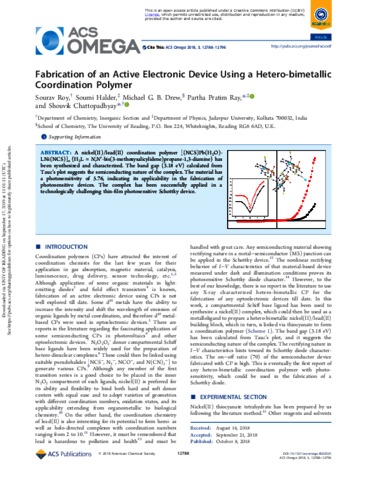 Roy, S., Halder, S., Drew, M. G. B., Ray, P. P. and Chattopadhyay, S. (2018) Fabrication of an Active Electronic Device Using a Hetero-bimetallic Coordination Polymer. ACS Omega, 3 (10). pp. 12788-12796. ISSN 2470-1343 doi: 10.1021/acsomega.8b02025