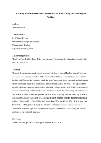 Davies, W. (2020) 'Crawling in the Flanders mud': Samuel Beckett, war writing and scatological pacifism. Journal of War and Culture Studies, 13 (2). pp. 145-162. ISSN 1752-6280 doi: 10.1080/17526272.2019.1644273