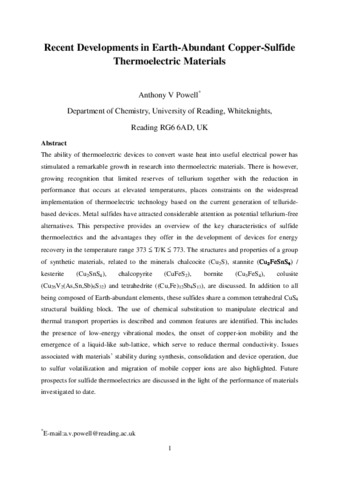 Powell, A. V. (2019) Recent developments in Earth-abundant copper-sulfide thermoelectric materials. Journal of Applied Physics, 126. 100901. ISSN 0021-8979 doi: 10.1063/1.5119345