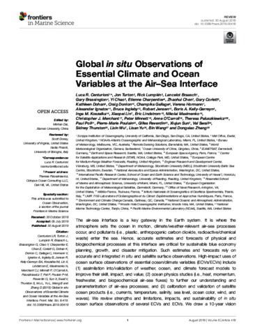 Centurioni, L. R., Turton, J., Lumpkin, R., Braasch, L., Brassington, G., Chao, Y., Charpentier, E., Chen, Z., Corlett, G., Dohan, K., Donlon, C., Gallage, C., Hormann, V., Ignatov, A., Ingleby, B., Jensen, R., Kelly-Gerreyn, B. A., Koszalka, I. M., Lin, X., Lindstrom, E., Maximenko, N., Merchant, C. J. orcid id iconORCID: https://orcid.org/0000-0003-4687-9850, Minnett, P., O'Carroll, A., Paluszkiewicz, T., Poli, P., Poulain, P.-M., Reverdin, G., Sun, X., Swail, V., Thurston, S., Wu, L., Yu, L., Wang, B. and Zhang, D. (2019) Global in situ observations of essential climate and ocean variables at the air–sea interface. Frontiers in Marine Science, 6. 419. ISSN 2296-7745 doi: 10.3389/fmars.2019.00419