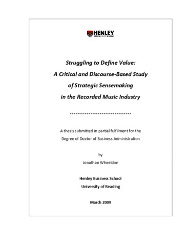 Wheeldon, J. (2009) Struggling to define value: a critical and discourse‐based study of strategic sensemaking in the recorded music industry. DBA thesis, Henley Business School, University of Reading.