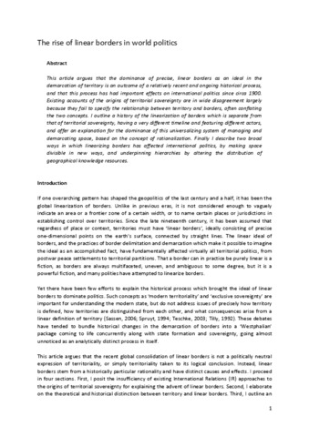 This article argues that the dominance of precise, linear borders as an ideal in the demarcation of territory is an outcome of a relatively recent and ongoing historical process, and that this process has had important effects on international politics since circa 1900. Existing accounts of the origins of territorial sovereignty are in wide disagreement largely because they fail to specify the relationship between territory and borders, often conflating the two concepts. I outline a history of the linearization of borders which is separate from that of territorial sovereignty, having a very different timeline and featuring different actors, and offer an explanation for the dominance of this universalizing system of managing and demarcating space, based on the concept of rationalization. Finally I describe two broad ways in which linearizing borders has affected international politics, by making space divisible in new ways, and underpinning hierarchies by altering the distribution of geographical knowledge resources.