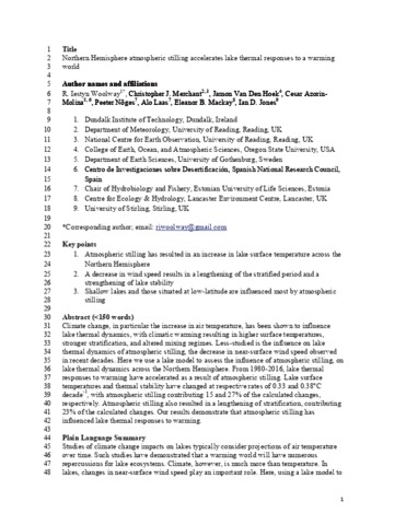 Northern Hemisphere atmospheric stilling accelerates lake thermal responses to a warming world.